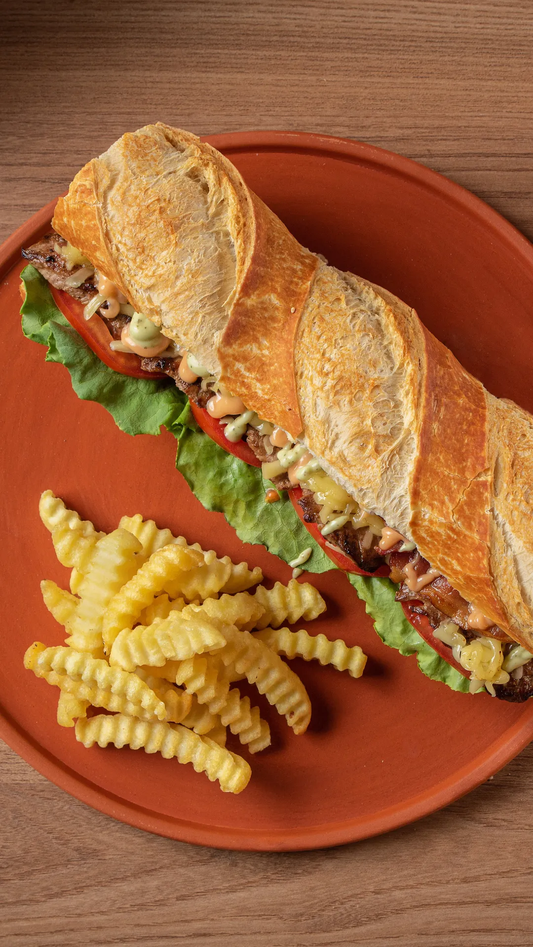Filete de lomo, queso mozzarella, tocino crocante, lechuga, tomate, salsa especial de la casa en pan baguette gourmet.